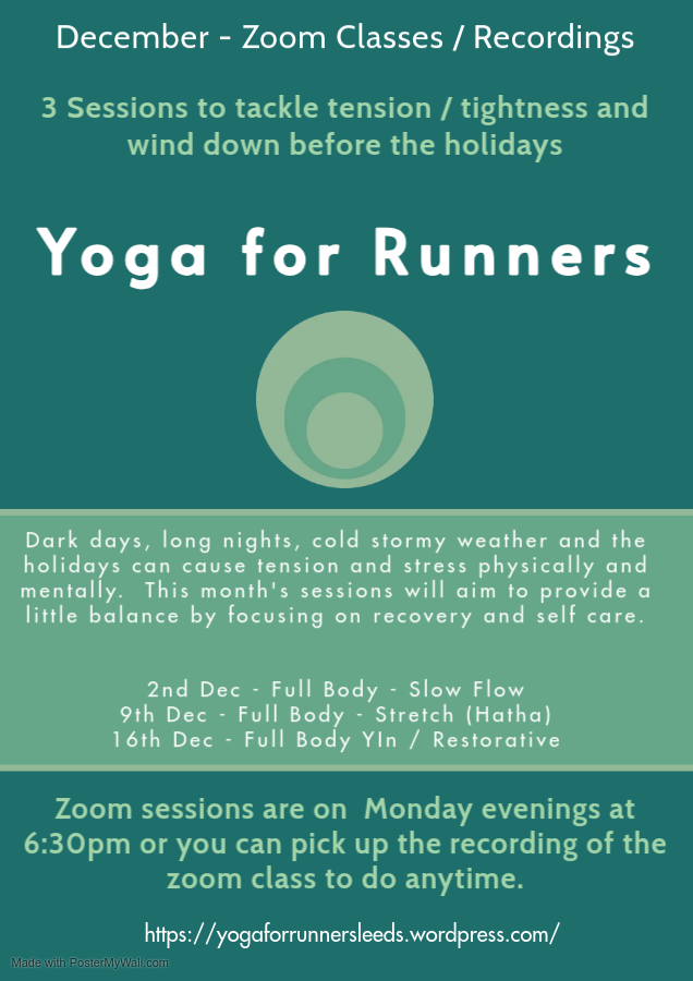 For the next block of sessions I have thought about the challenging weather and how hectic the holidays can be with family and social obligations. The focus for December is self care, stress relief and recovery. We’ll make sure the cold hasn’t tightened our bodies in knots (or attempt to undo the knots) and ease stress that can manifest as fatigue and make running more challenging. We will stretch and chill, taking things a little more slowly each week until we grind to a halt and lie like broccoli.