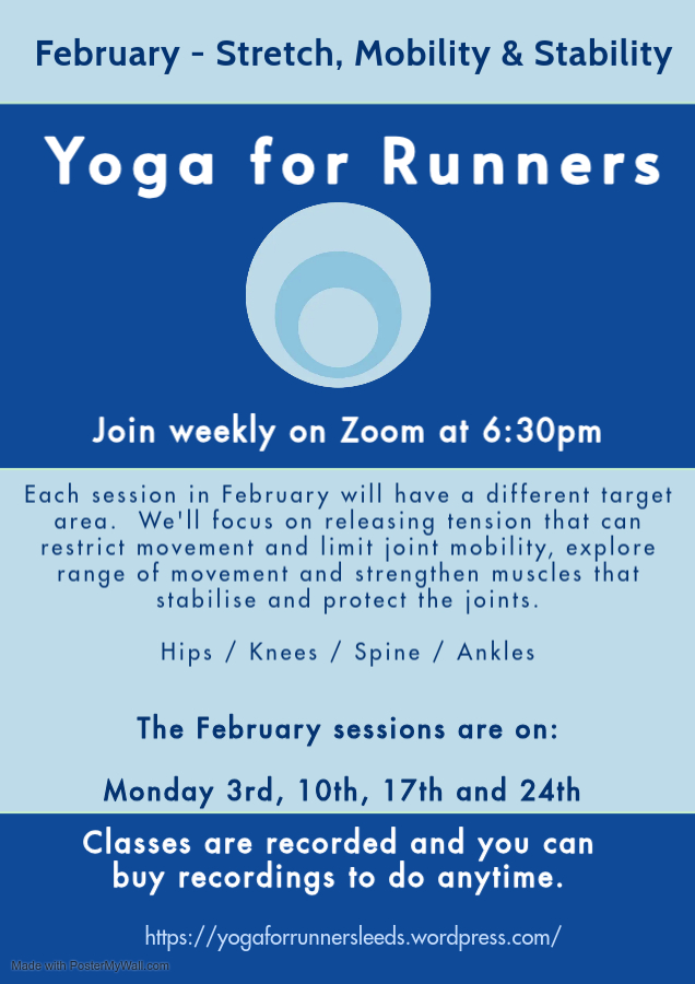 We’re back in Otley on the 12th February for our monthly class. This will be a rounded session to support your running with an mix of tension release and strengthening poses / movements. Before the session starts I’ll check in to see if there are any requests, niggles or requirements and make sure the class includes what you need.