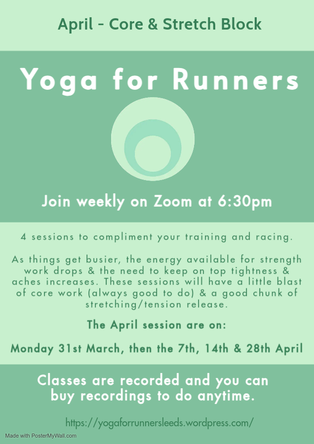 We’re back in Otley on the 9th April for our monthly class. This is an all-round session to support your running with a mix of joint mobility, tension release and strengthening poses / movements.