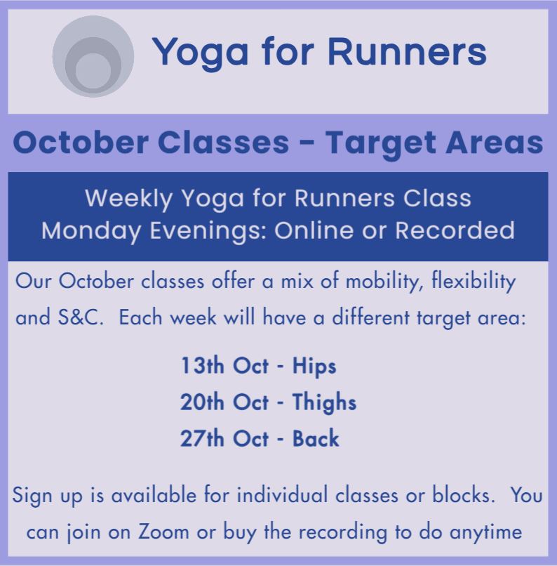 Our October Monday night Yoga for Runners sessions will have a different target area each week. These will be hips, thighs and back. There be a mix of mobility, flexibility and S&C in each class to keep these key focus areas moving well.