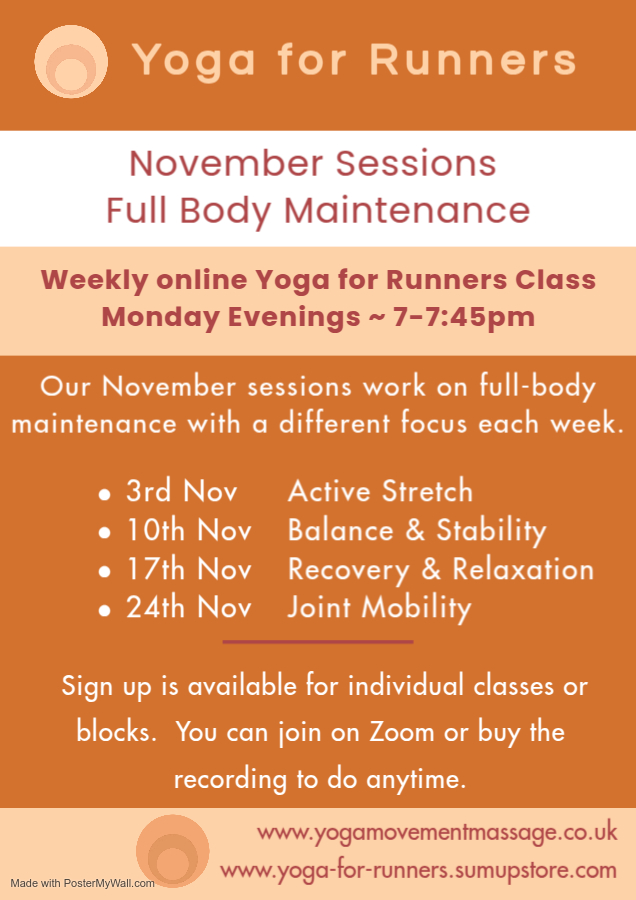 My coaching is mainly with Pudsey & Bramley AC at the moment, but I am working with a couple of athletes too. I don’t have a suite of plans or packages that I offer, but I’m happy to have a chat with anyone wanting support, advice or coaching – just drop me a message at yoga.movement.massage@gmail.com